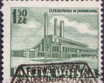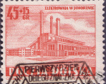♦ Na małym zielonym znaczku za 1,50 zł jest elektrownia jaworznicka taka, jak będzie wyglądać po całkowitym ukończeniu prac. Na razie stoi połowa tego długiego, biegnącego w perspektywę gmachu. Druga część jest w budowie. W dokumentacji technicznej nazywają to „drugim etapem”.