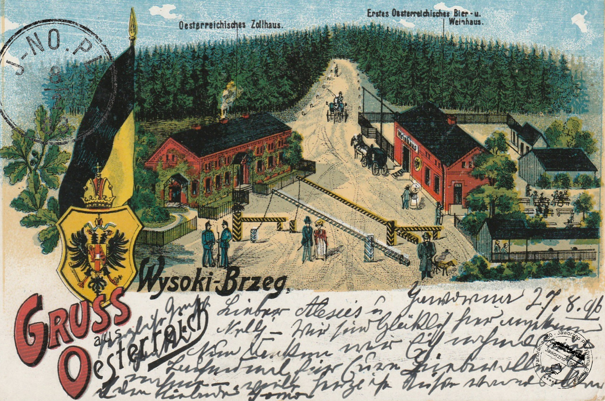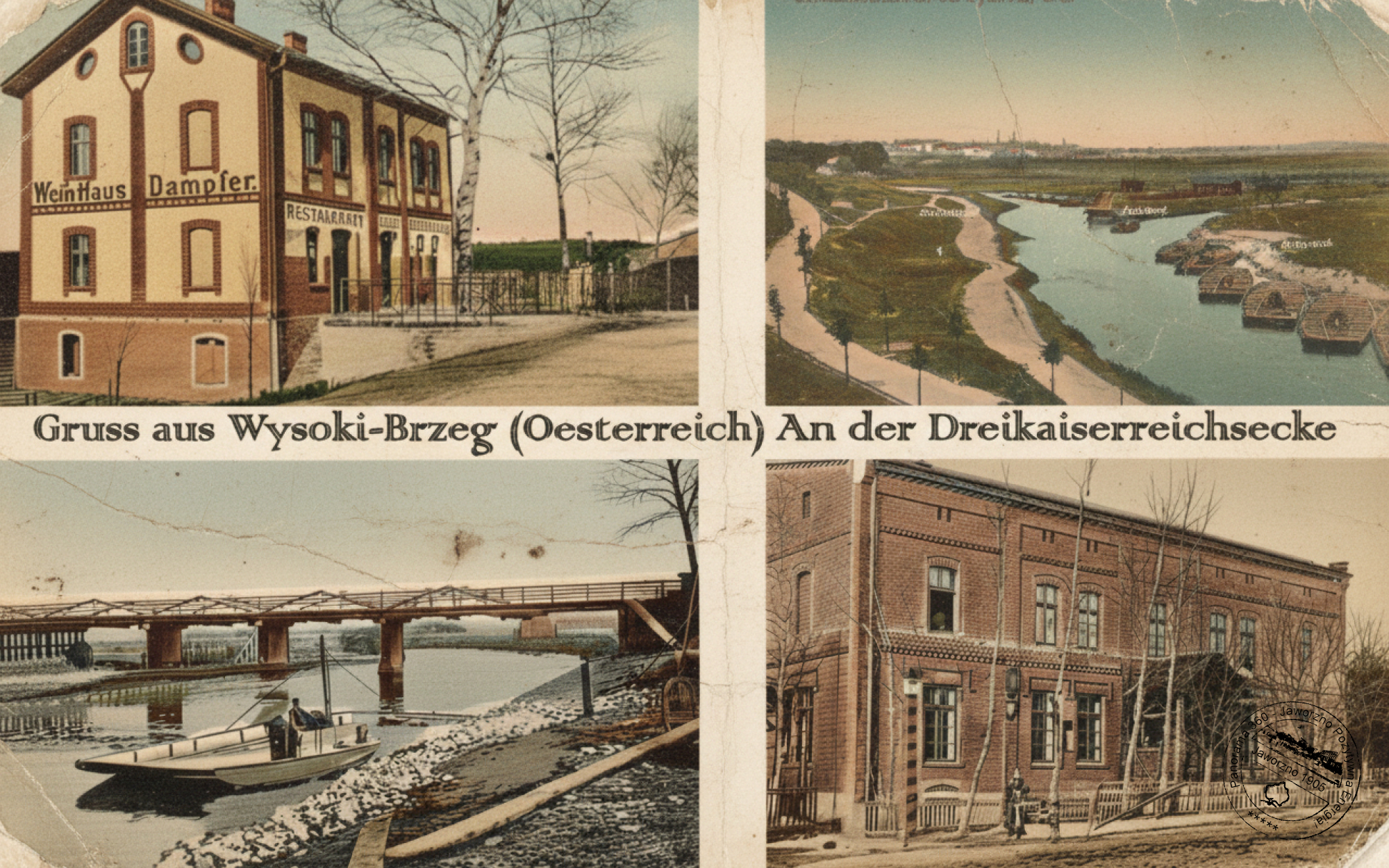 Był tu wtedy drewniany most łączący przyległe graniczne osady. Od strony Jaworzna było kilka zabudowań, w tym m.in. budynek urzędu celnego, a także kultowy niegdyś Dom Wina i Piwa Stefana Kurtza. Za budynkiem restauracji był ogród ze stolikami i ławeczkami dla podróżnych i obieżyświatów. Lokal był reklamowany jako pierwsza pijalnia wina i piwa po stronie austriackiej. Za zakrętem w Wysokim Brzegu ciągnął się las, a jego środkiem biegła droga aż do Dąbrowy. Jak widać, topografia terenu niewiele zmieniła się do dziś; jedynie droga w stronę Dąbrowy wyraźnie opadła wskutek działalności górniczej.