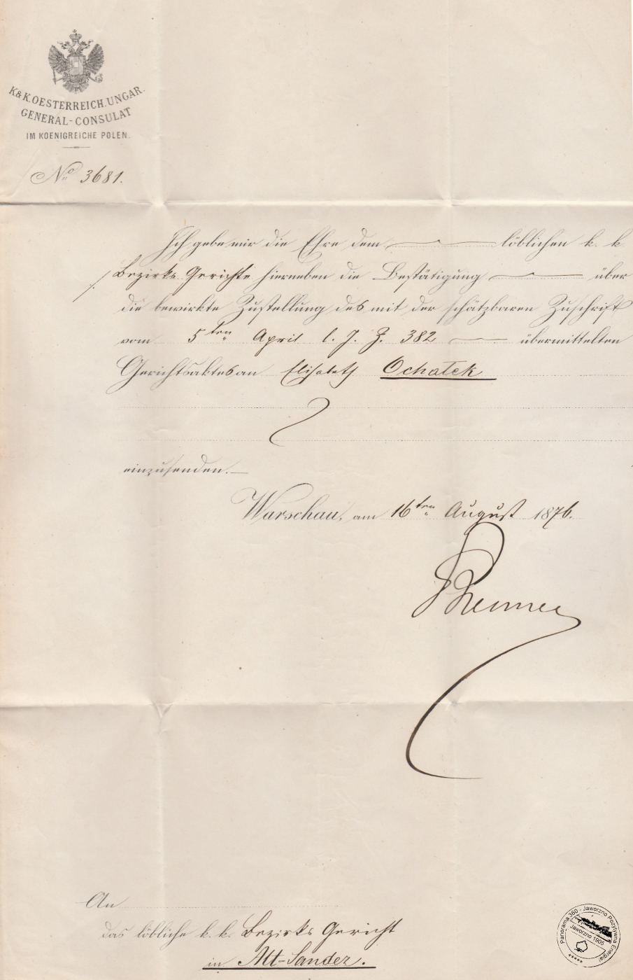 Dlaczego ta historia jest wyjątkowa? List przebył drogę z Warszawy do Starego Sącza (ok. 350 km i przejście przez granicę mocarstw) w 7 dni. Jak na tamte czasy, przy braku internetu i telefonów, był to wynik imponujący, pokazujący potęgę XIX-wiecznej poczty kolejowej. Czerwona pieczęć lakowa (zalepka) zachowała się w niemal idealnym stanie, stanowiąc dziś gratkę dla kolekcjonerów. Choć pismo jest skrajnie formalne, kryje w sobie nazwisko konkretnej osoby – Elżbiety (Elisabeth) Ochałek. Dzięki takim dokumentom historia przestaje być tylko datami, a staje się opowieścią o ludziach, którzy mimo kordonów granicznych, starali się zachować ciągłość swoich spraw życiowych.