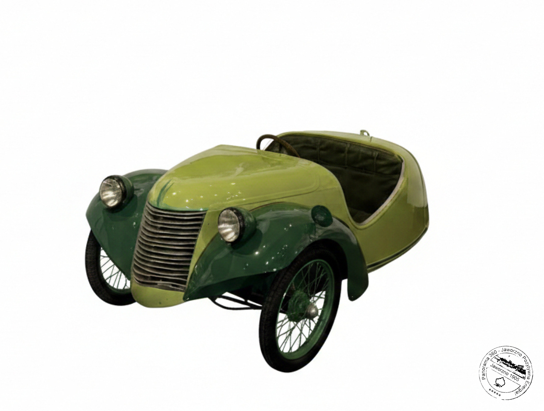 Silnik motocyklowy DKW 500 cm³ umieszczony jest na specjalnych antywibracyjnych poduszkach gumowych. Napęd na przednie koła. Wóz mój zaopatrzony jest w pełną instalację elektryczną (stacyjka z kluczykiem, reflektory, szperacz i sygnał), szybkościomierz; może pomieścić obok siebie trzy osoby. Rozwija przy tym szybkość do 80 km/godz.