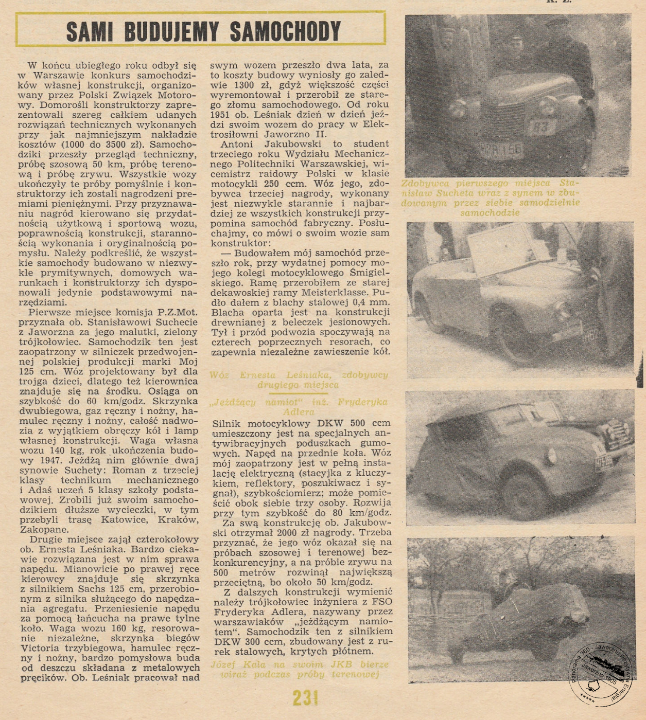 ♦ Drugie miejsce zajął czterokołowiec ob. Ernesta Leśniaka. Bardzo ciekawie rozwiązana jest w nim sprawa napędu. Mianowicie po prawej ręce kierowcy znajduje się skrzynka z silnikiem Sachs 125 cm³, przerobionym z silnika służącego do napędzania agregatu. Przeniesienie napędu za pomocą łańcucha na prawe tylne koło. Waga wozu 160 kg, resorowanie niezależne, skrzynia biegów Victoria trzybiegowa, hamulec ręczny i nożny, bardzo pomysłowa buda od deszczu składana z metalowych pręcików. Ob. Leśniak pracował nad swym wozem przeszło dwa lata, za to koszty budowy wyniosły go zaledwie 1300 zł, gdyż większość części wyremontował i przerobił ze starego złomu samochodowego. Od roku 1951 ob. Leśniak dzień w dzień jeździ swoim wozem do pracy w Elektrosiłowni Jaworzno II.