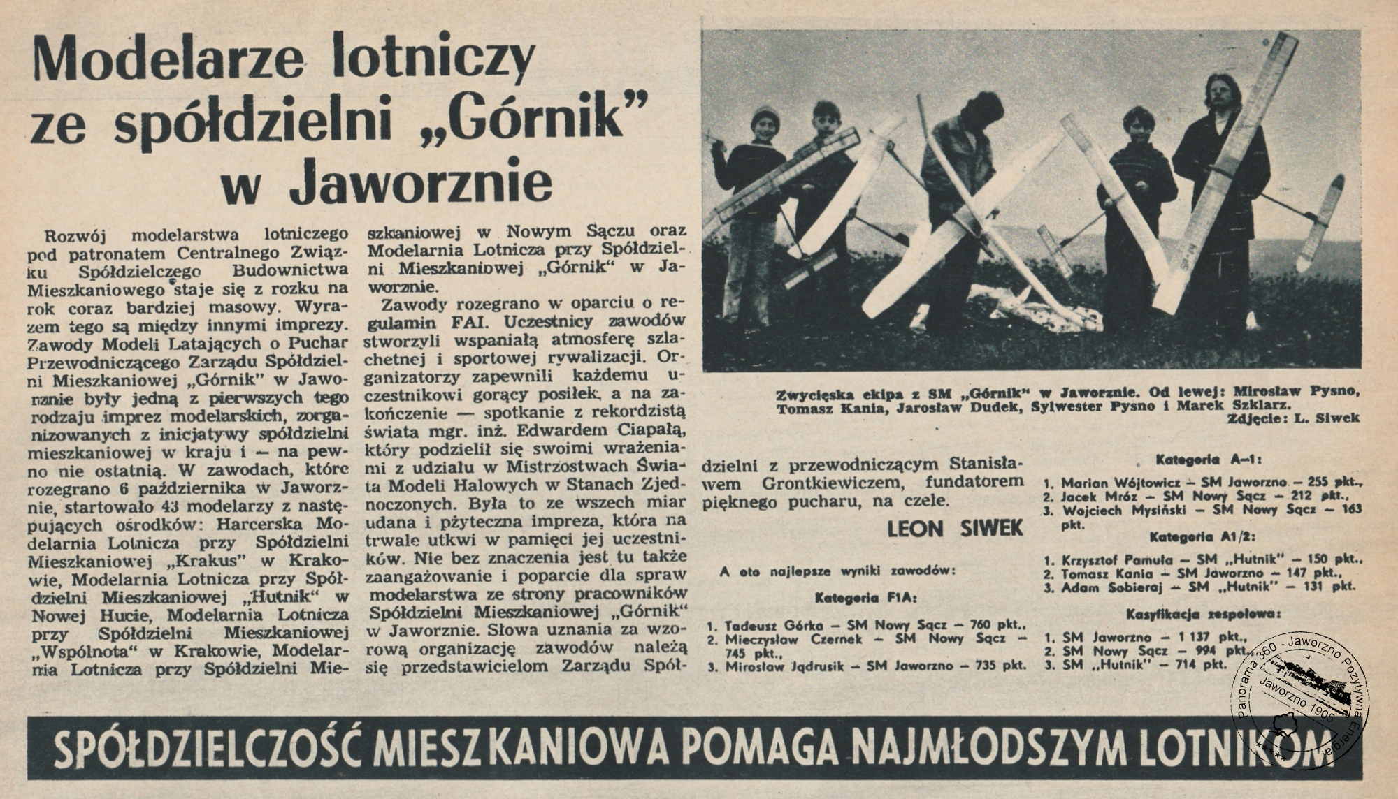 Rozwój modelarstwa lotniczego pod patronatem Centralnego Związku Spółdzielczego Budownictwa Mieszkaniowego staje się z roku na rok coraz bardziej masowy. Wyrazem tego są między innymi imprezy. Zawody Modeli Latających o Puchar Przewodniczącego Zarządu Spółdzielni Mieszkaniowej „Górnik” w Jaworznie były jedną z pierwszych tego rodzaju imprez modelarskich, zorganizowanych z inicjatywy spółdzielni mieszkaniowej w kraju i — na pewno nie ostatnią. W zawodach, które rozegrano 6 października w Jaworznie, startowało 43 modelarzy z następujących ośrodków: Harcerska Modelarnia Lotnicza przy Spółdzielni Mieszkaniowej „Krakus” w Krakowie, Modelarnia Lotnicza przy Spółdzielni Mieszkaniowej „Hutnik” w Nowej Hucie, Modelarnia Lotnicza przy Spółdzielni Mieszkaniowej „Wspólnota” w Krakowie, Modelarnia Lotnicza przy Spółdzielni Mieszkaniowej w Nowym Sączu oraz Modelarnia Lotnicza przy Spółdzielni Mieszkaniowej „Górnik” w Jaworznie.